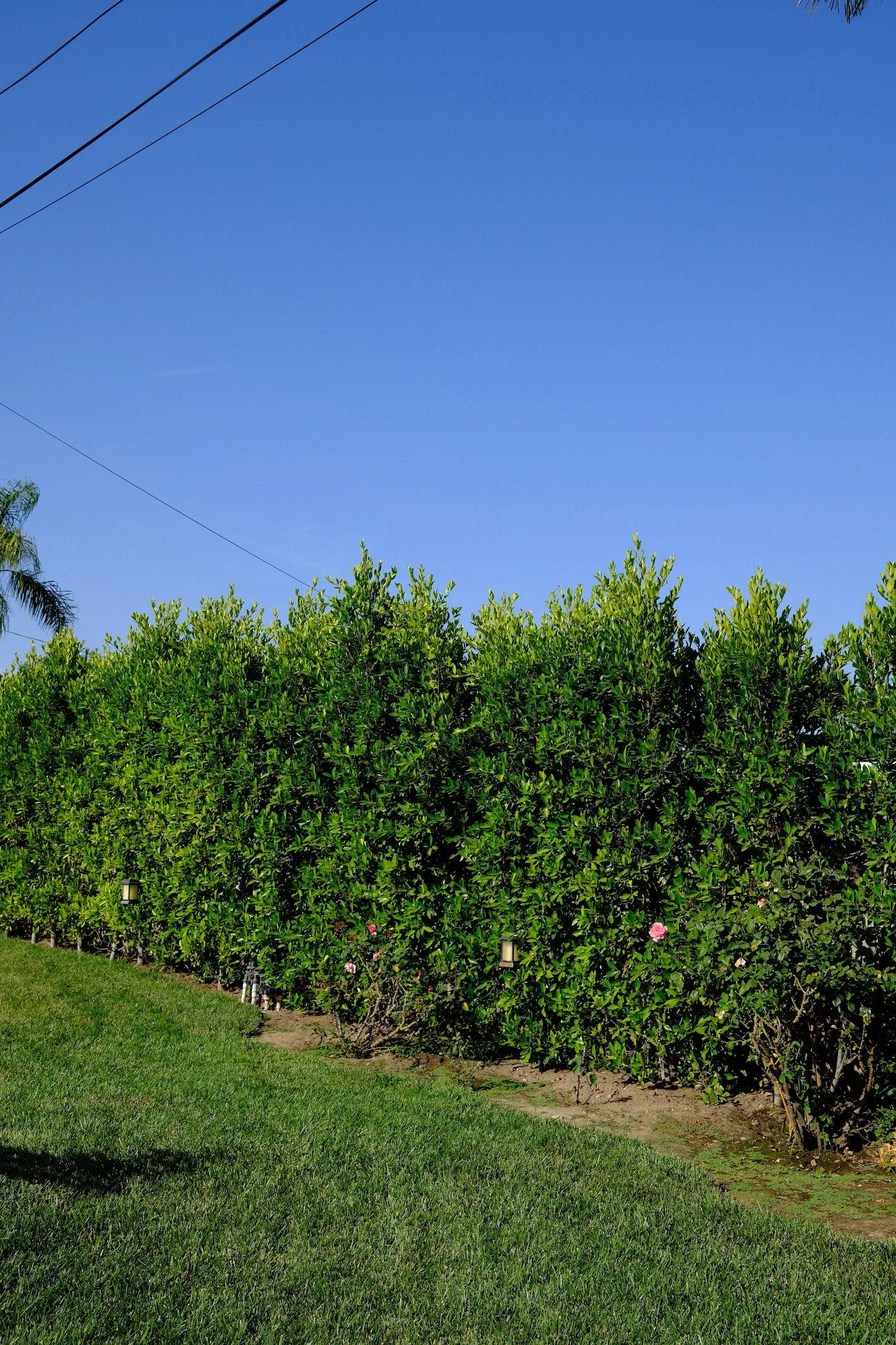 • The backyard has lush green grass, citrus trees (oranges and lemons), a large oak tree, mature ficus, and a freeform pool adorned with music note tiles and lined with red brick. Vintage outdoor furniture is available upon request.